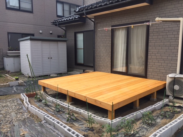 SPFツーバイ材(2×6)を使用したウッドデッキが完成しました!これまでの腐ったウッドデッキを撤去し、コンクリート束石は再利用。大きさは縦横約3メートル。今回はデッキのみですが、木製ならではですが、手摺も後付けが可能です。子供のプールを置いたり、バーベキューもできます。「これからの夏が楽しみです」とお客様に喜 ばれました!!